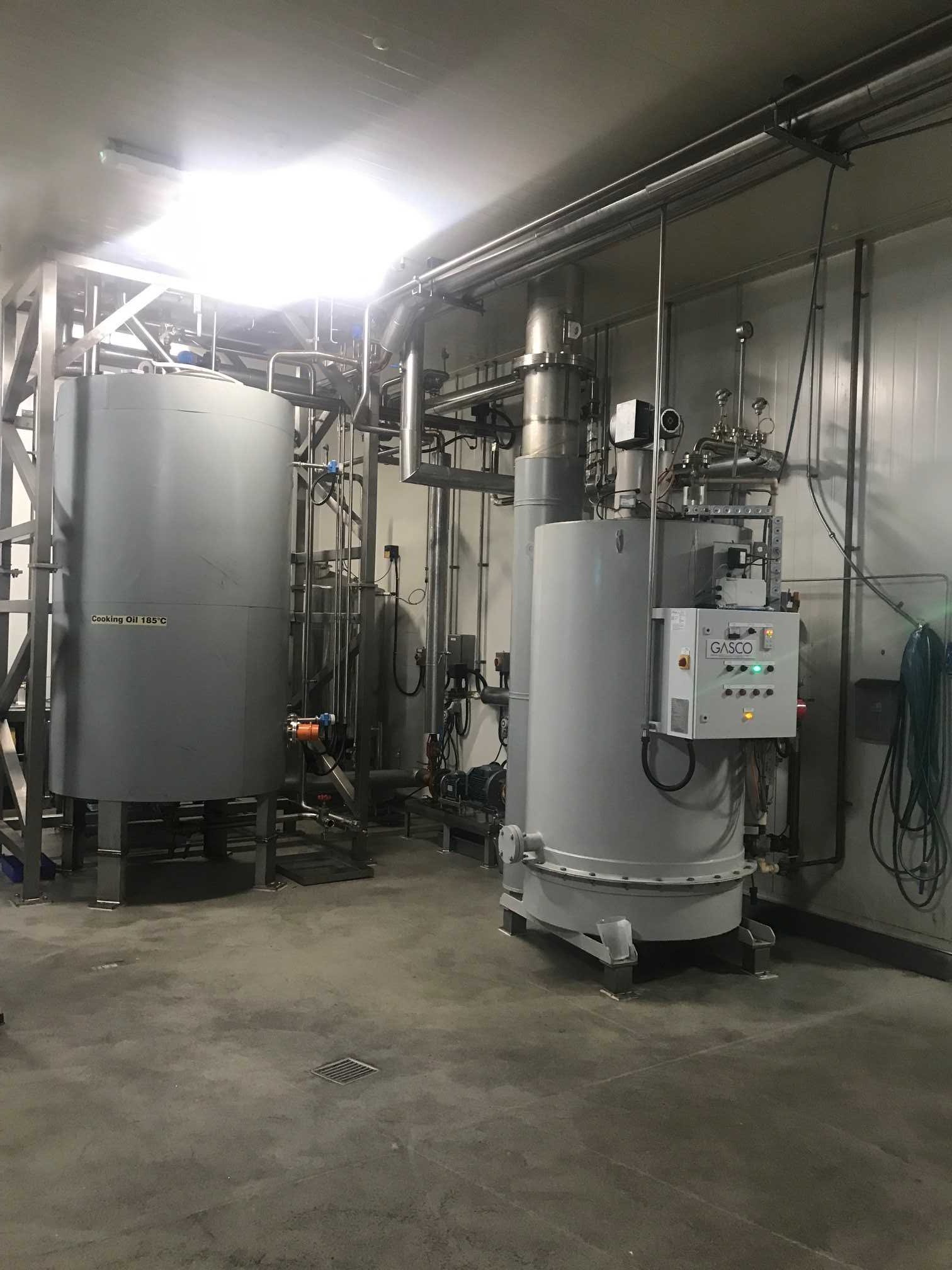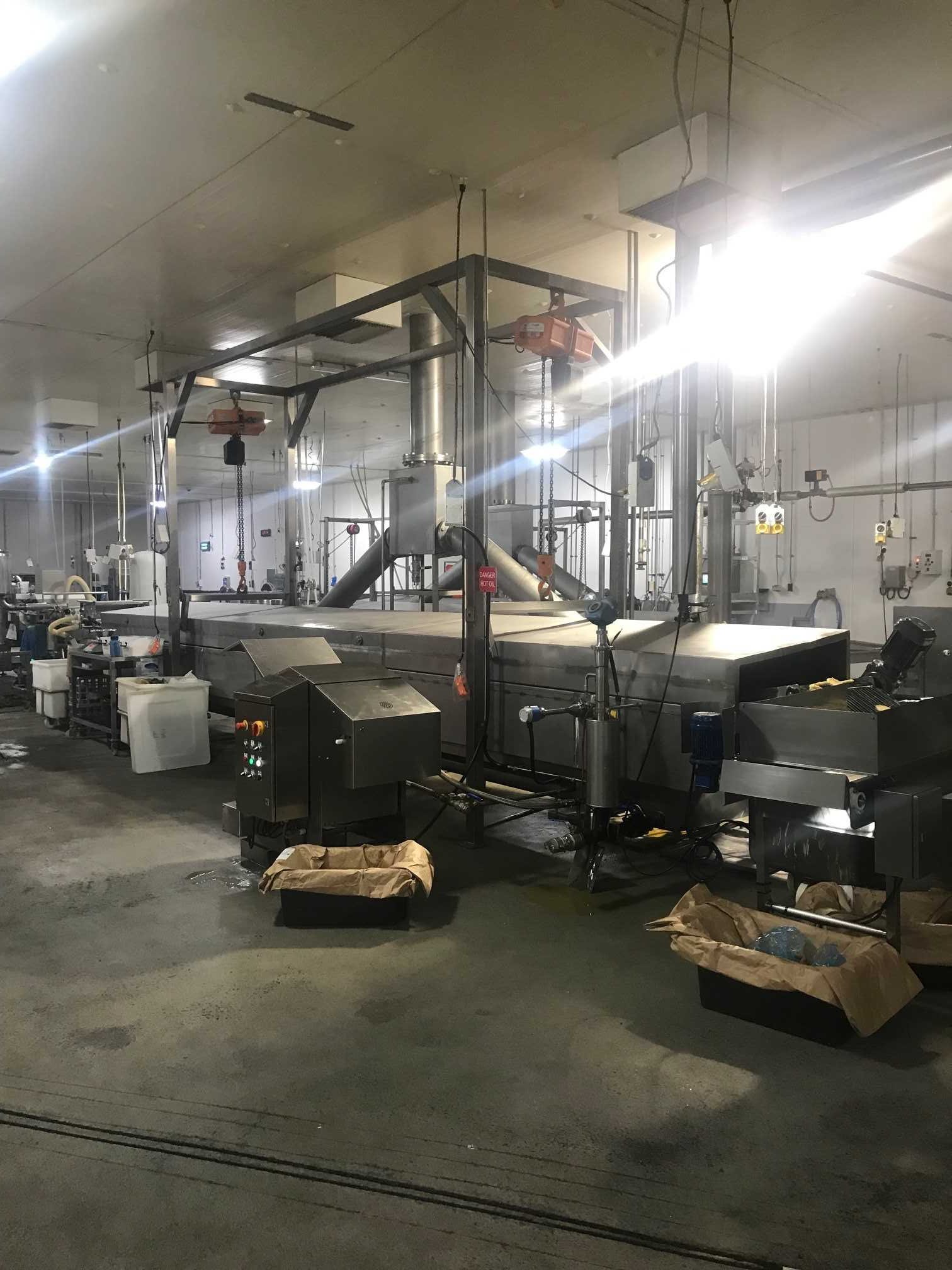 - Automated continuous fryer with gas fired heat exchanger and oil heating system.
